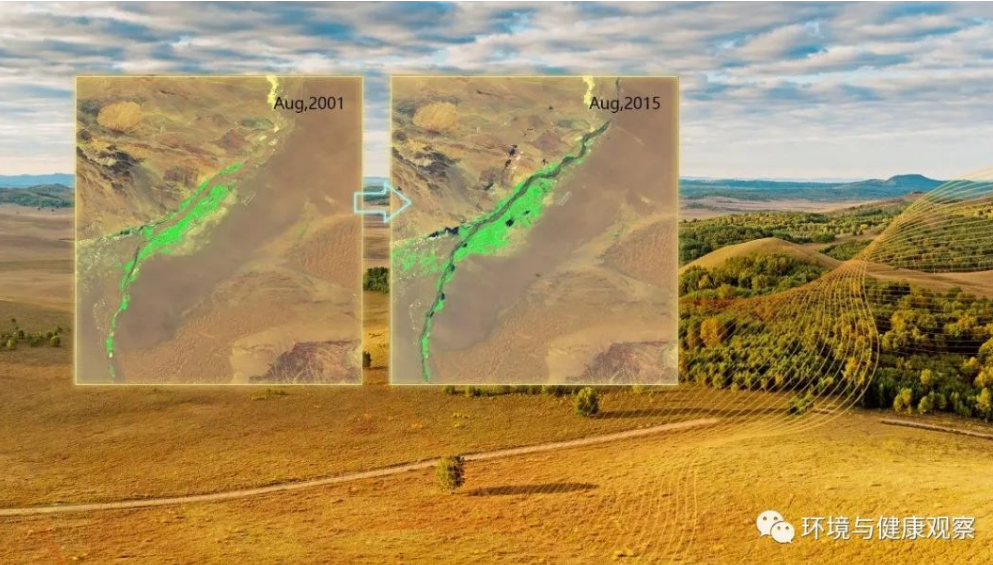 2001至2015年间,研究区草地面积总面积从568平方公里变为741平方公里,增长了约30%。利用深度学习模型进行归因分析发现,其中62%的植被变化归因于该流域自2000年起实施的生态流量管理,32%来源于流域中上游自然水文变化产生的跨界影响,而研究区当地的气候变化因素仅占23%。生态流量管理和跨界影响均通过恢复研究区地下水而产生作用。