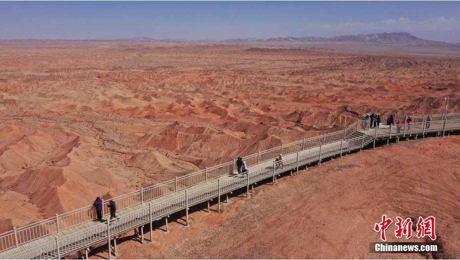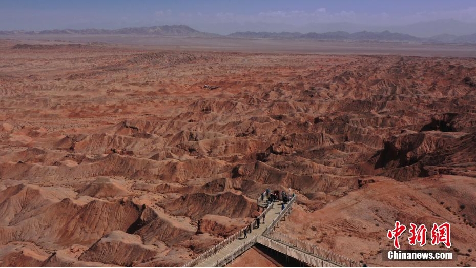5月22日,航拍青海省海西蒙古族藏族自治州大柴旦行政区柴旦镇红崖火星地貌景区。该景区2017年7月被中国科学院月球与深空探测总体部选定为首个“中国火星模拟基地”和“中国最像火星的地方”。图为摄影爱好者和游客在景区拍照打卡。(无人机照片)