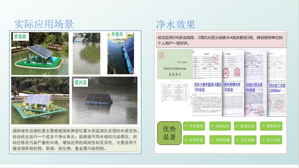 案例2:陕西某缓流湖泊蓝藻暴发,机器人通过微纳米曝气+藻菌固定化技术,1个月内蓝藻密度下降80%,重现“水清岸绿”。