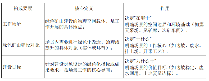 绿色矿山工作场景,是指在特定空间内,围绕明确建设对象、为达成绿色化目标而开展的系统性工作集合。其核心构成要素为工作场所、建设对象与建设目标,三者共同构建了“空间载体-核心对象-目标导向”的有机统一体,相互支撑、缺一不可,共同界定了场景的具体形态与价值方向。