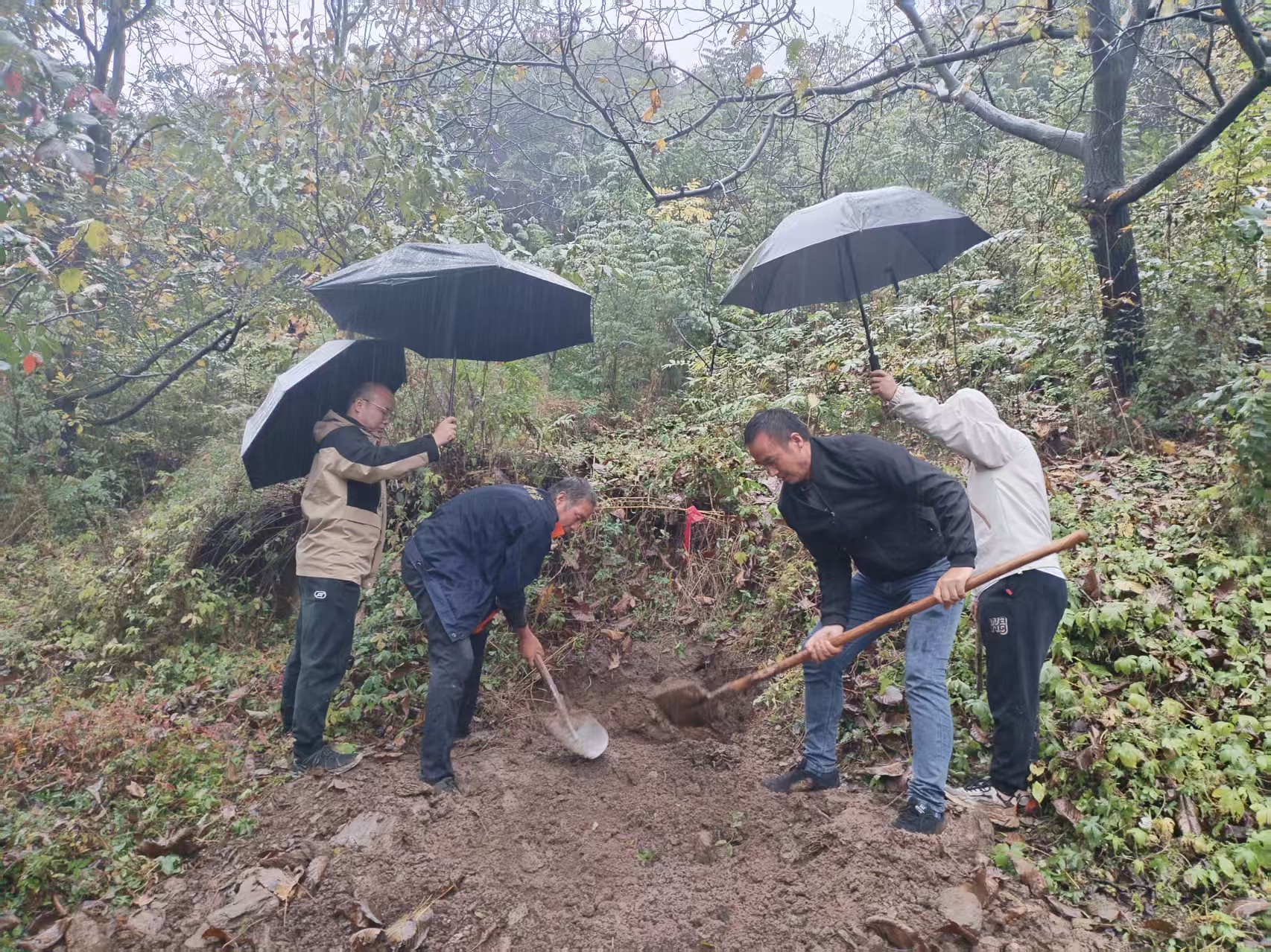 “设备都做好防护了,”王岩峰笑着摆手,雨水顺着他的发梢滴落,“趁雨势稳定,正好测量土壤含水量,数据更准确。”他弯腰取出登山杖,向山坡迈去,每一步都在泥地上留下坚定的脚印。