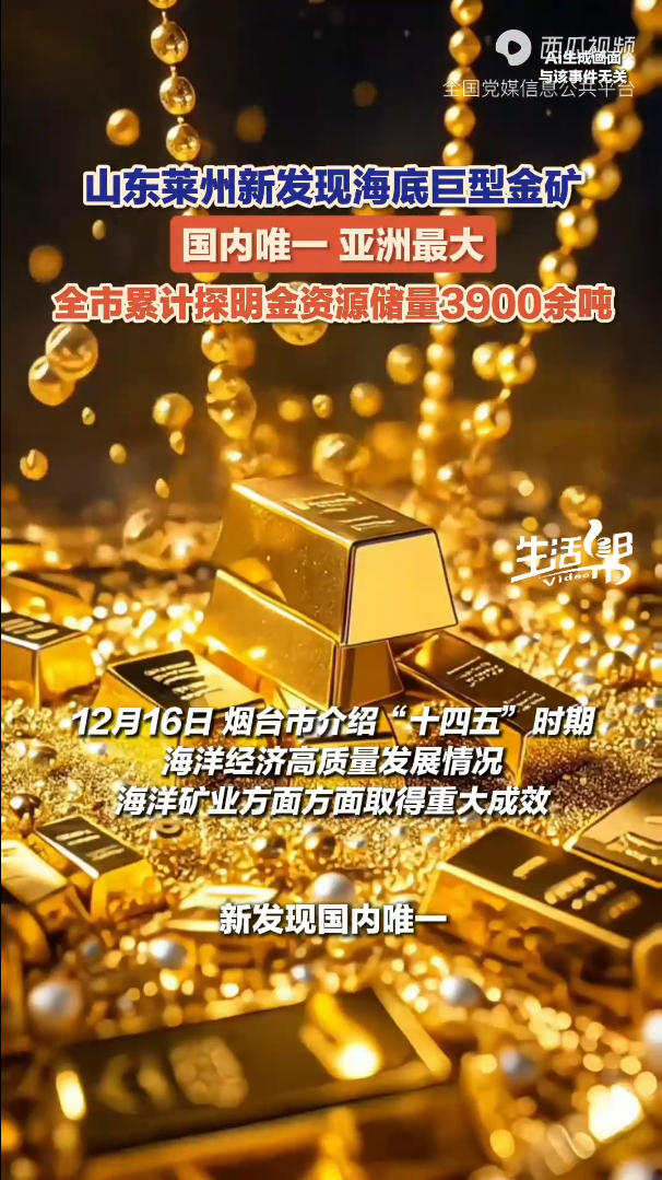山东莱州新发现海底巨型金矿 国内唯一 亚洲最大 全市累计探明金资源储量3900余吨
