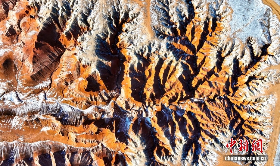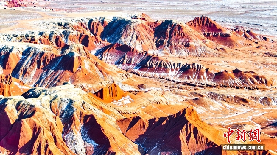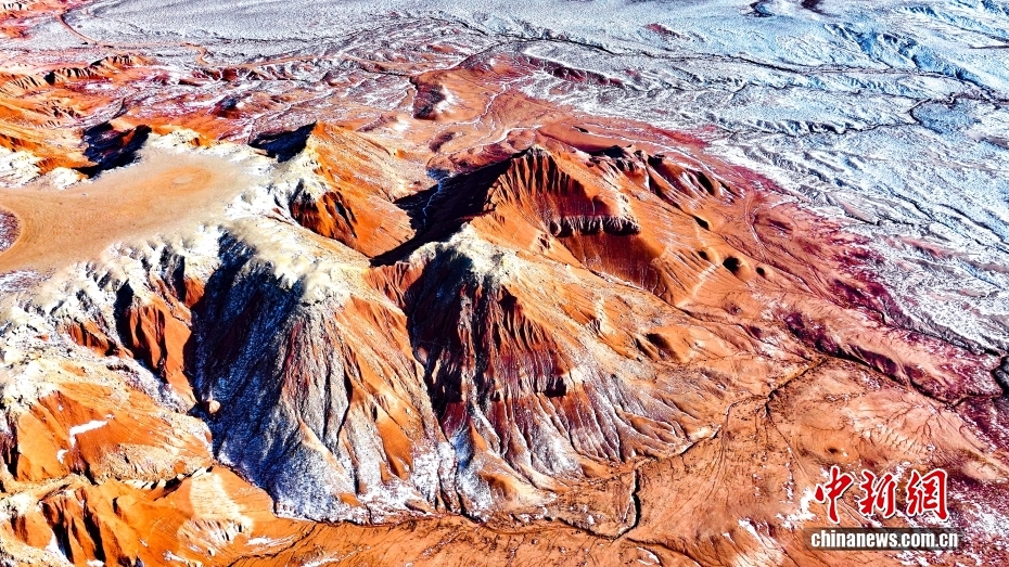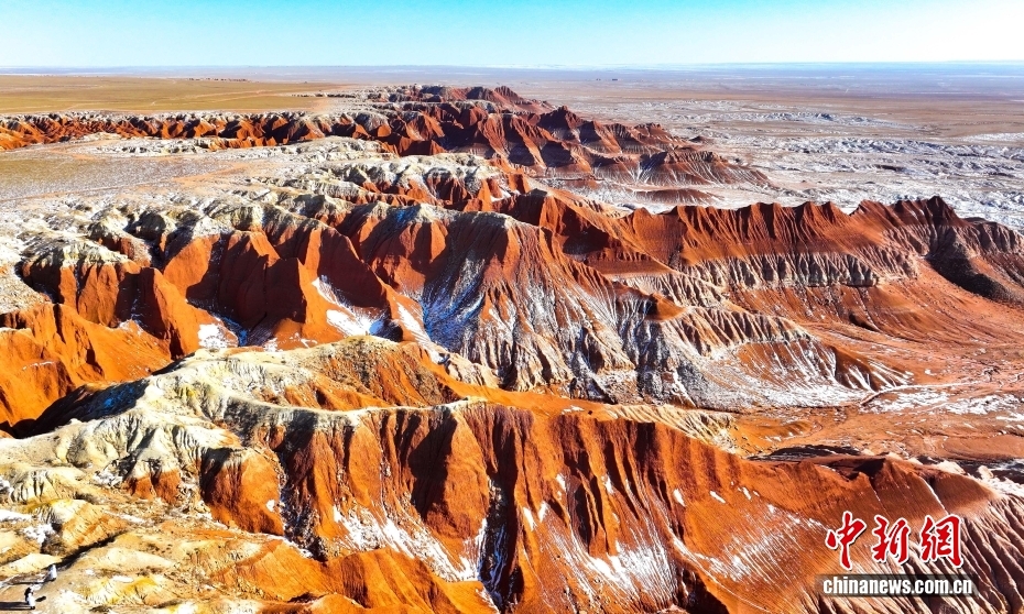 红崖台地位于内蒙古乌兰察布市四子王旗北部,山体呈现红色,随季节变化深浅交替,为典型的丹霞地貌,南北长约15公里,东西宽约10公里,当地人称“大红山”,是四子王国家地质公园的重要组成部分。隆冬时节,雪色下的红崖台地色彩浓烈,景色壮美。图为2026年1月27日拍摄的红崖台地景色。(无人机照片)