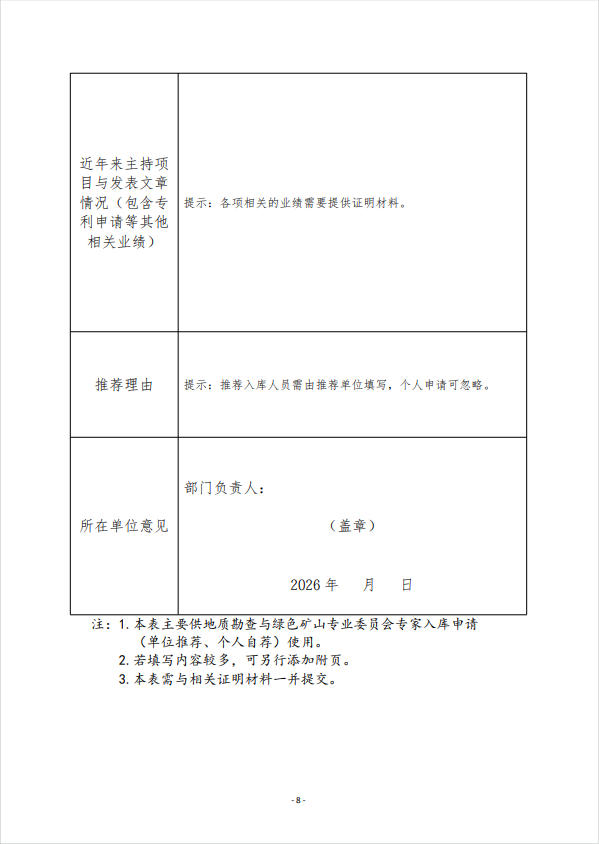 附:《地质勘查与绿色矿山专业委员会专家库推(自)荐申请表》
