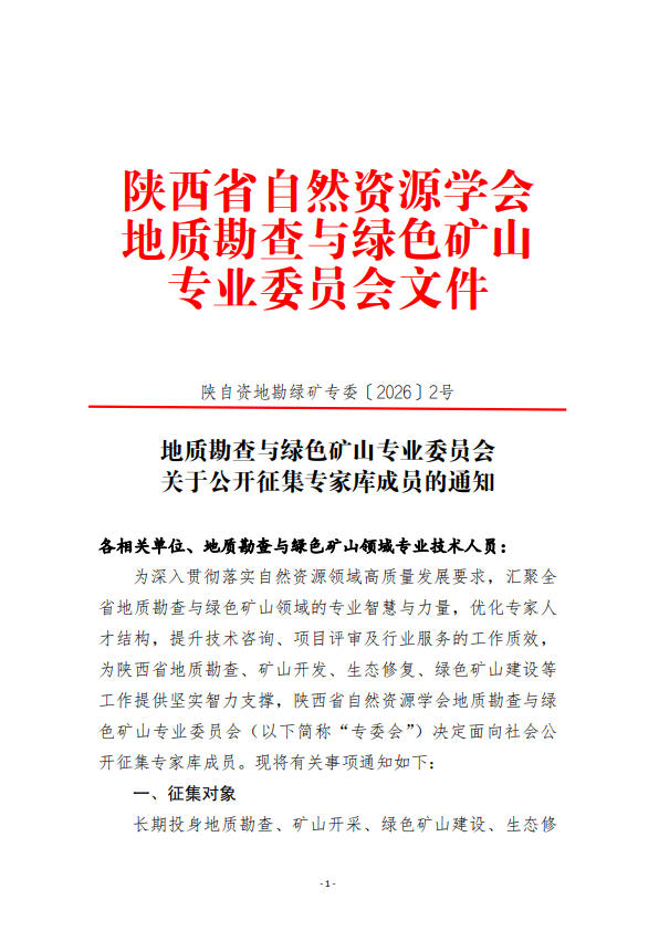 为深入贯彻落实自然资源领域高质量发展要求,汇聚全省地质勘查与绿色矿山领域的专业智慧与力量,优化专家人才结构,提升技术咨询、项目评审及行业服务的工作质效,为陕西省地质勘查、矿山开发、生态修复、绿色矿山建设等工作提供坚实智力支撑,陕西省自然资源学会地质勘查与绿色矿山专业委员会(以下简称“专委会”)决定面向社会公开征集专家库成员。现将有关事项通知如下: