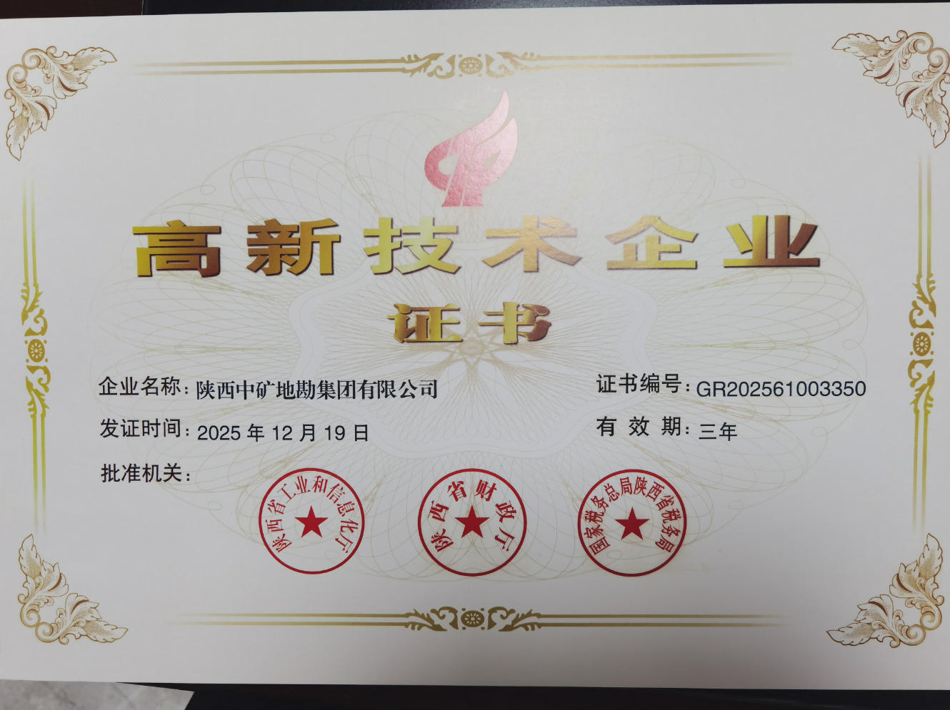 近日,陕西省工业和信息化厅、陕西省财政厅、国家税务总局陕西省税务局联合授予陕西中矿地勘集团有限公司(以下简称“陕西中矿地勘”)国家高新技术企业。
