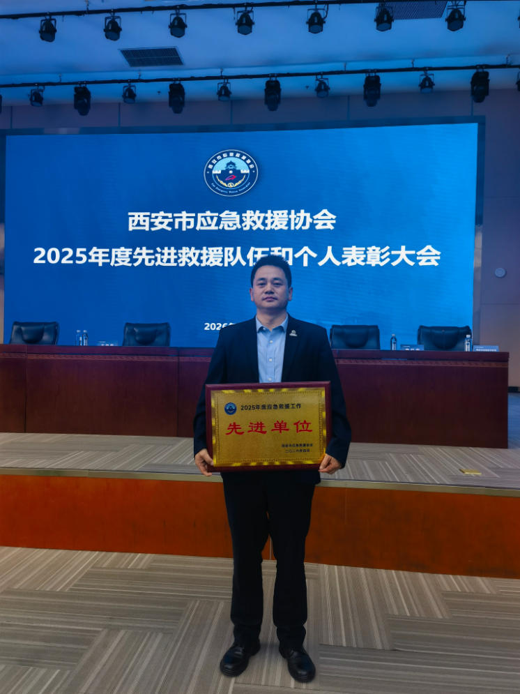 培训结束后,大会举行表彰仪式,对2025年度表现突出的应急救援先进单位及个人予以通报嘉奖,并颁发奖牌与证书。西安市海鑫应急救援队凭借全年扎实的应急备勤、实战处置及志愿服务工作,获评2025年度应急救援工作先进单位,队长游银代表队伍上台领奖。
