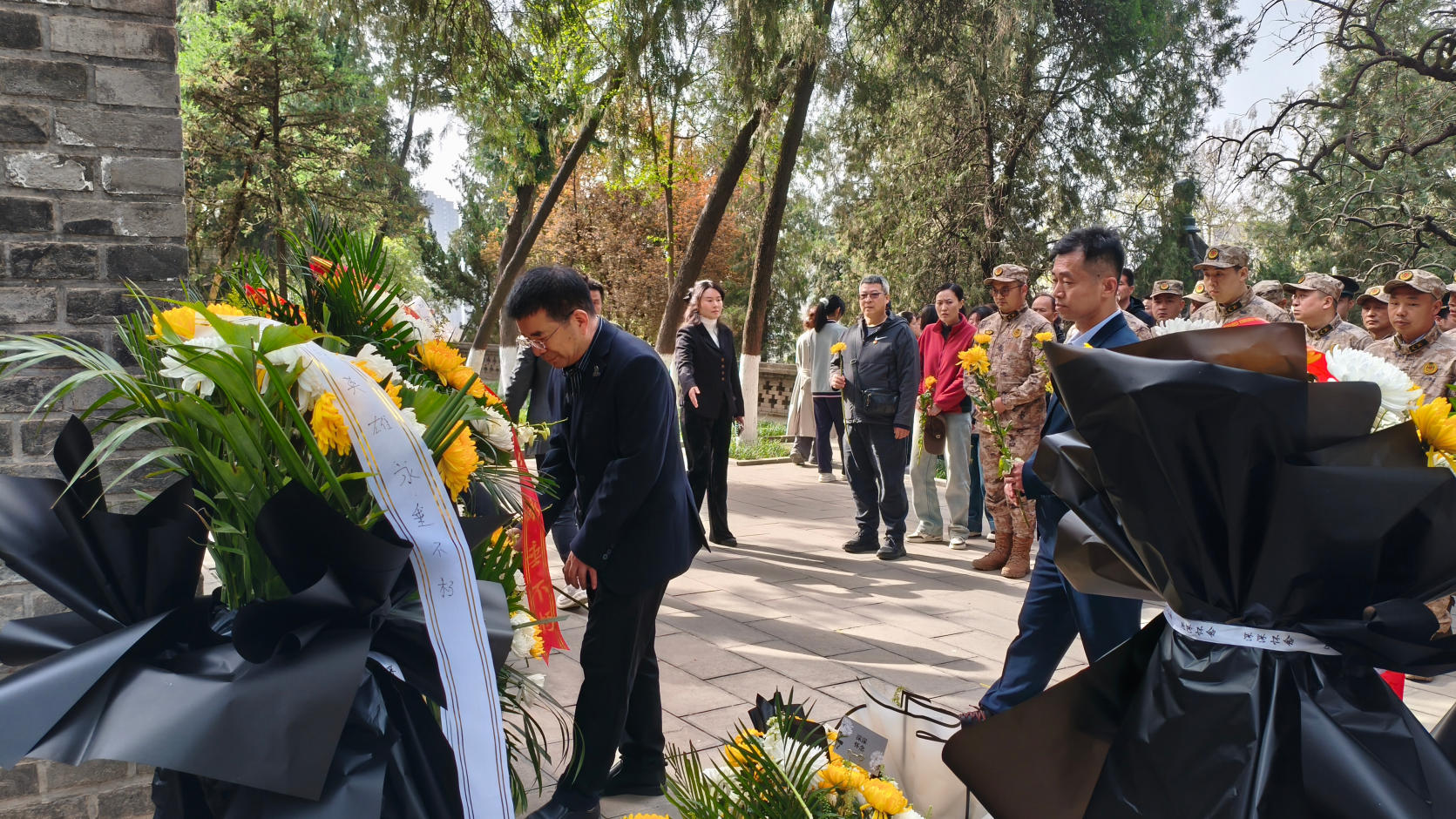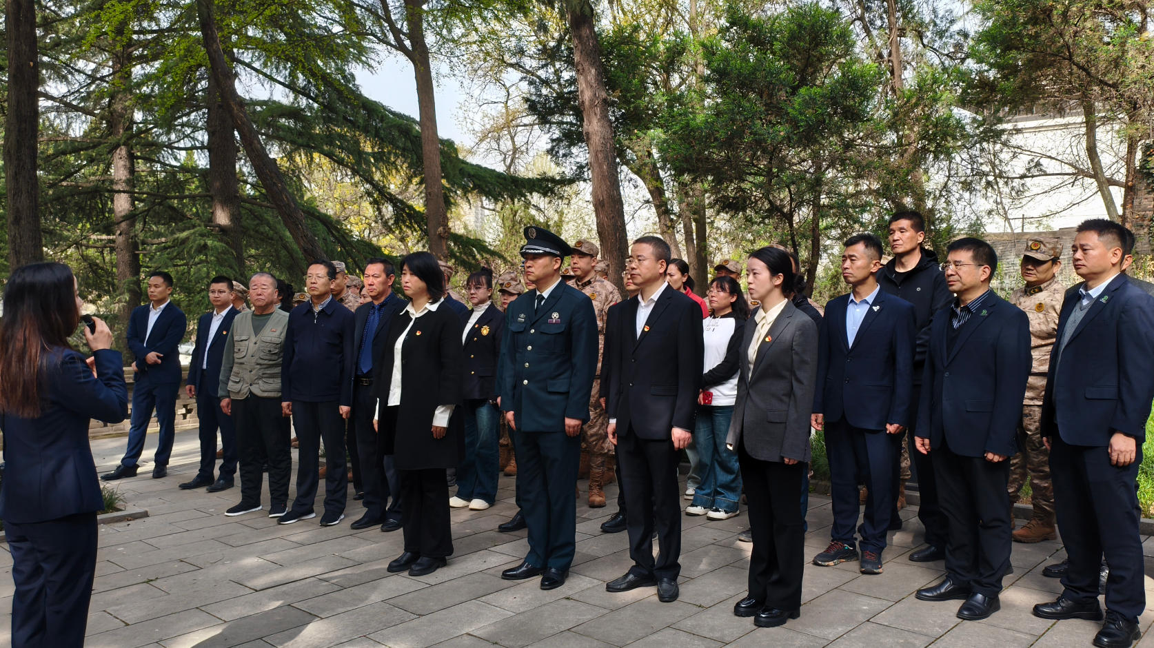 活动于杨虎城将军陵园隆重举行,现场松柏挺拔、庄严肃穆,革命先烈的崇高气节令人肃然起敬。活动由西安市长安区人民武装部副部长主持,地环科技集团参与人员仪表端庄、着装整洁,以无比崇敬之心整齐列队,向革命先烈表达致敬。默哀环节,全场肃立,静默致哀,深切追思杨虎城将军等革命先烈为国家独立与民族解放作出的壮烈牺牲;默哀结束后,华曙光董事长带领参与人员依次上前,向英烈敬献鲜花、鞠躬致敬,以简朴而庄重的方式寄托追思与敬意,彰显地环科技集团对英烈精神的尊崇与传承。