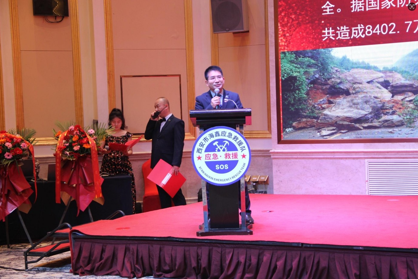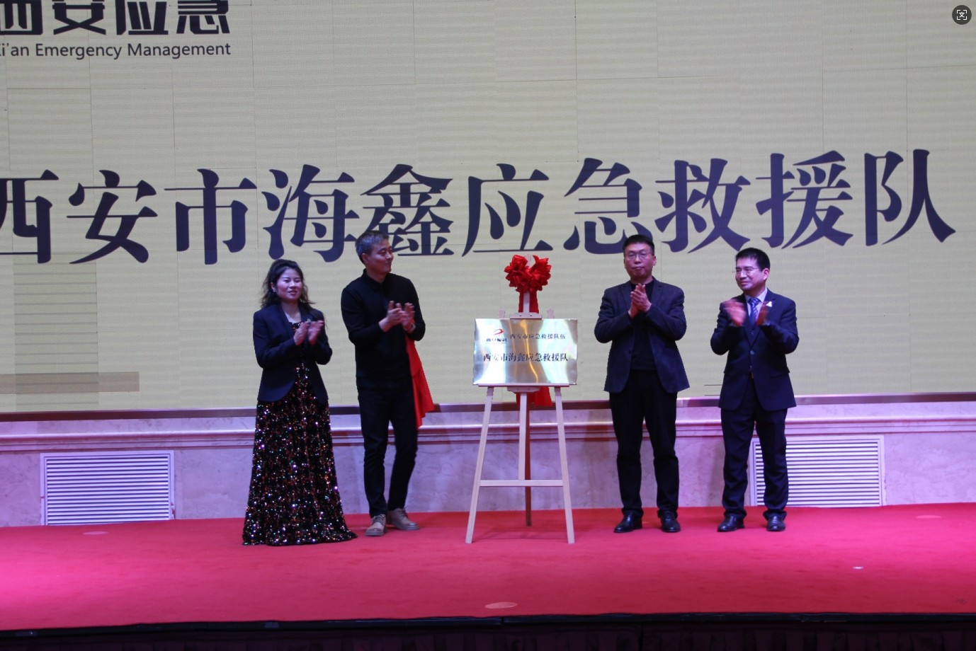 在庄严的音乐声中,西安市民政局社会组织管理局、西安市应急管理局预案局领导和西安市海鑫应急救援队负责的华曙光、董兆钦共同登台,为“西安市海鑫应急救援队”揭牌。