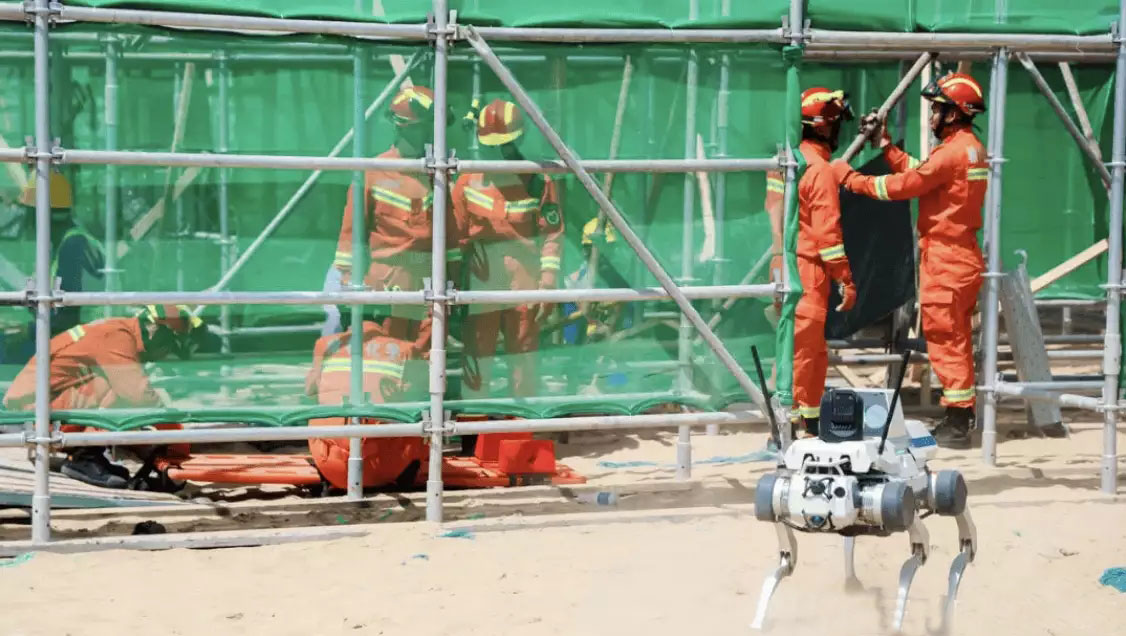在如此复杂的演练场景中,四足机器人凭借其先进的技术和卓越性能,成为救援行动中的关键力量。其搭载的先进步态算法与环境感知技术,赋予了机器人极强的运动能力和机动性,使其能够灵活上下45°的楼梯,稳健攀爬镂空楼梯,实现第一时间响应突发任务需求,快速深入脚手架坍塌的复杂场景中。