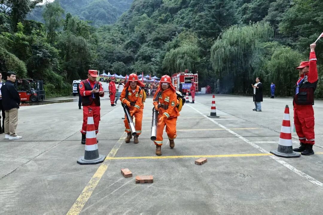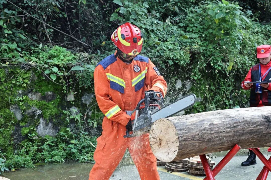 在负重越野接力项目中,各队队员身着专业装备,负重奔跑交接,对个人体能和团队协作进行考核。油锯切割实操环节,队员们熟练操作油锯,精准切割圆木,考验了队员们对专业工具的使用能力和在复杂环境下的操作精准度。